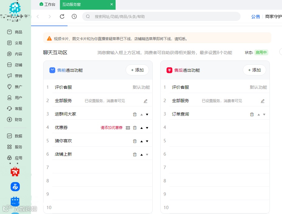 如果你怕店铺的优惠券或者活动难以被顾客发现,那么在这里再一次设置你的优惠券或者活动入口在互动服务窗中顾客与你对话的第一时间就会看到已经设置好的活动标签。