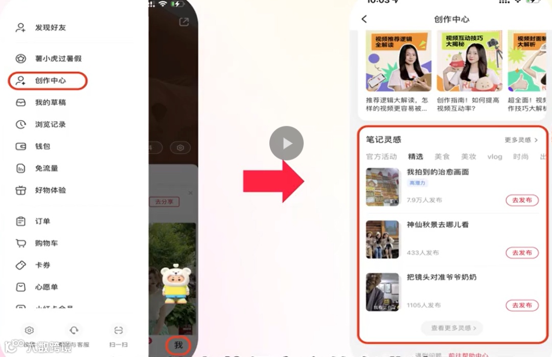 我---创作中心--笔记灵感,找到不同类目的笔记特门话题,根据自己的账号定位选择合适的话题,还可能会获得免费流量。