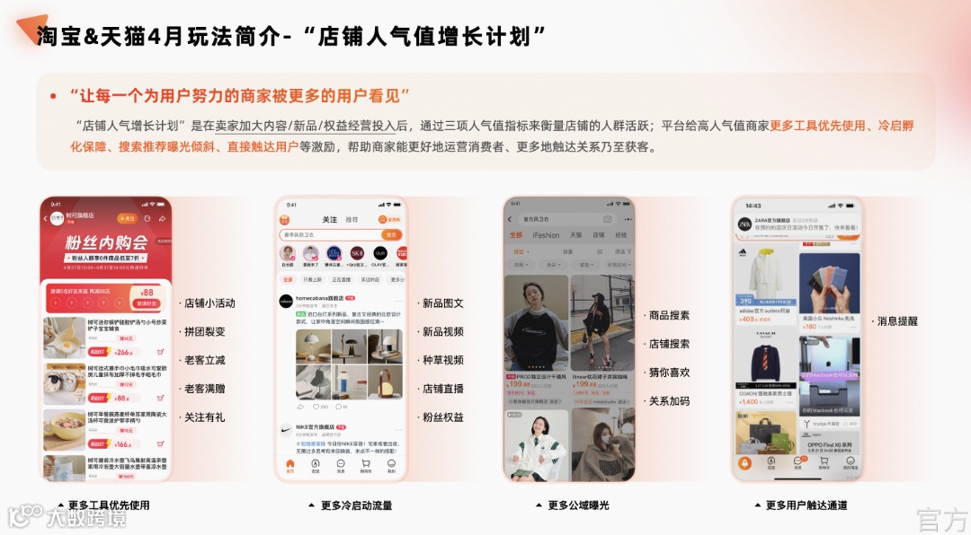 这一计划核心包含两点:其一、私域与手淘公域的联通,通过搜索流量和信息流的支持,淘宝将为私域运营划出更大的“蛋糕”,商家只需努力为用户投入,并且获得足够的用户人气,就能获得更多推荐。