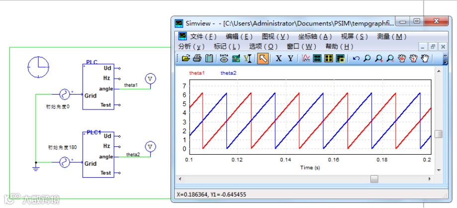 为了验证锁相算法的正确性,设置两个不同角度的市电电压源,通过锁相锁相模块输出看看锁相算法是否正常与否,仿真结果如下图: