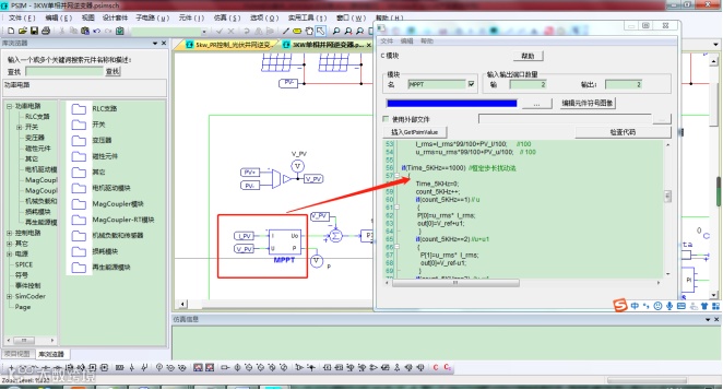 本案例利用PSIM软件C_block功能将MPPT(最大功率跟踪)控制算法、市电锁相算法、逆变并网功率调度算法与太阳能帆板、功率电路集成而形成光伏逆变器完整系统模型,针对用户关注的MPPT、试点锁相、全系统随动性能等进行了仿真分析,为设计人员在早期进行算法、拓扑等验证工作提供了有效的支撑。