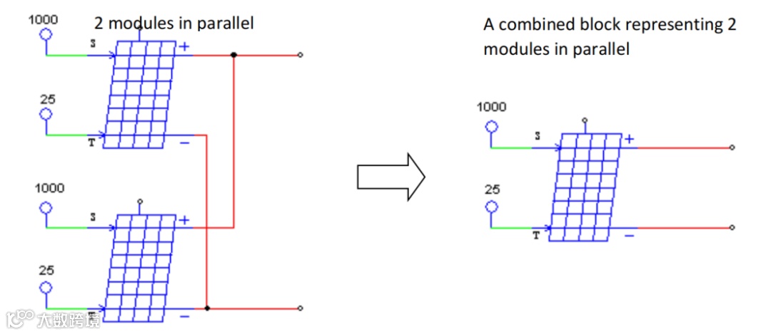 在其他情况下,几个相同的太阳能模块并联连接形成一个太阳能阵列。可以使用太阳能模块块来模拟太阳能阵列。