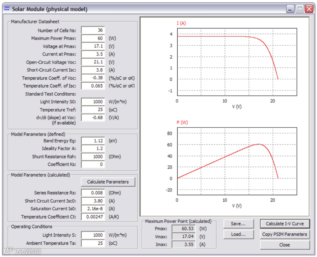 可能需要多次迭代和试验才能获得与数据表或实验数据的良好拟合。参数确定后,单击Copy PSIM Parameters按钮将模型参数复制到PSIM原理图中。也可以将数据表和参数值保存到文本文件中以供以后使用,请单击“保存”按钮,将其保存到文件(例如“Solarex MSX-60.txt”)。要将加载特定太阳能模块的数据,请单击Load按钮。