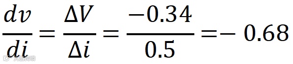 在Voc处的dv/di(斜率)指的是在开路电压Voc为21.1V时dv/di斜率。从数据表I-V特性中,通过从图表中读取数值(用红色虚线标记),我们可以计算出斜率: