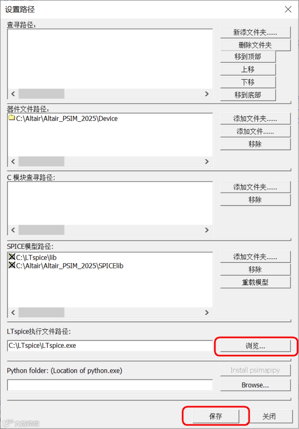 在PSIM软件的菜单中点击“选项》设置路径”,会出现两个与SPICE相关的路径设置窗口,见下图红色标记所示: