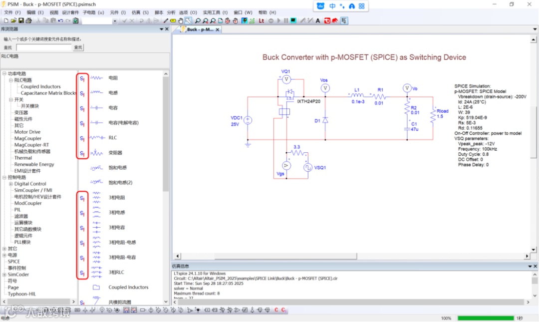 在完成上述设置之后,PSIM软件就可以与LTspice软件协同工作了,你可以通过PSIM软件自带的案例来进行测试。打开PSIM自带的SPICE案例,默认情况下这些案例位于目录C:\Altair\Altair_PSIM_2025\examples\SPICE Link中。