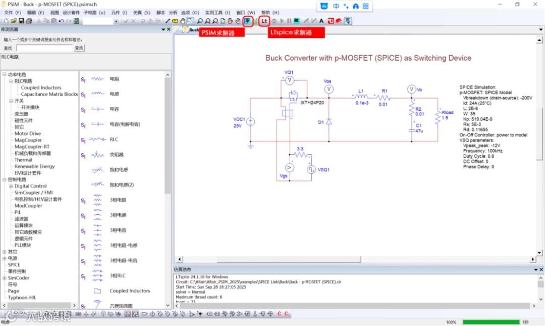 在PSIM的主菜单上,有多个仿真器可以进行选择,您可以使用PSIM仿真器,也可以使用LTspice仿真器。