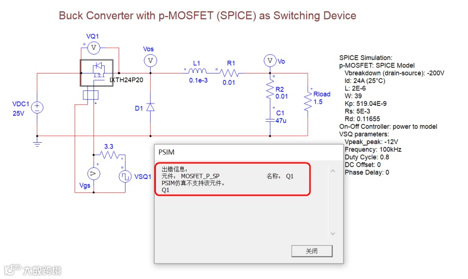 对于该电路,因为其有SPICE模型,如果你采用PSIM求解器,则会报错: