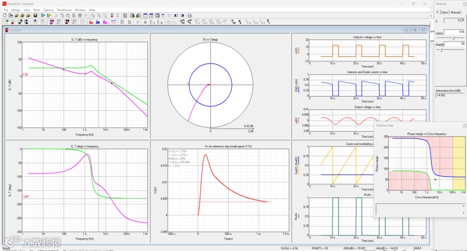 (6) 如图 7 所示,模拟回路已设计完成,点击OK完成向导。SmartCtrl将启动分析视图,在该视图中,波特图、奈奎斯特图、瞬态图和稳态波形可用于分析所设计系统的稳定性和动态响应,见图 8。