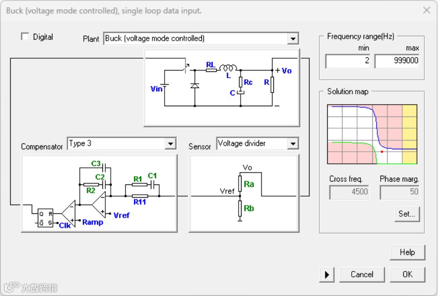 (2) 选择一个降压型电压模式控制的被控对象(见图 2),并输入图 3 所示的被控对象参数。注意,Digital复选框未勾选。