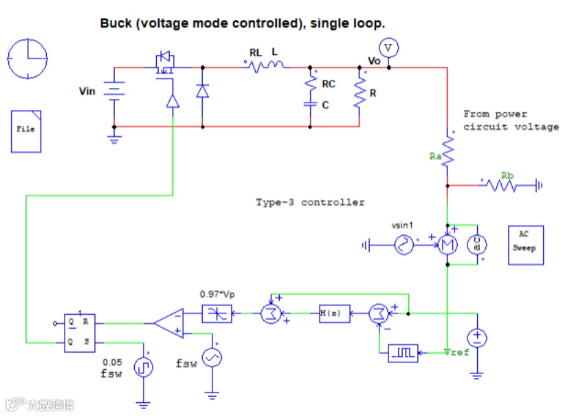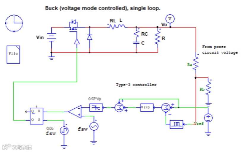 在PSIM原理图中包含功率级和数字控制级,同时包含一个后沿脉宽调制器。在这个特定的实现中,调制器引入的时间延迟等于D/fsw,其中D是对应于稳态工作点的占空比,fsw是开关频率。