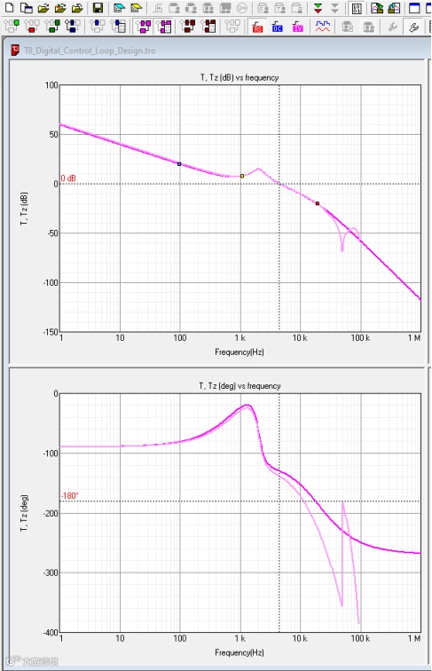 如图12所示,可以将模拟补偿器(深粉色曲线)和数字补偿器(浅粉色曲线)绘制在一起进行比较。这种离散化函数仅在穿越频率处是精确的(因为已对函数进行了预畸变处理),在其他任何点都会存在微小偏差。