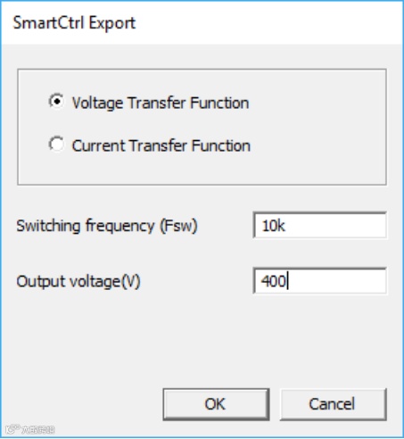 点击图 4 所示的SmartCtrl按钮打开 SmartCtrl。此操作会将 PSIM 交流分析得出的频率响应数据发送至 SmartCtrl。输入输出电压和开关频率,然后点击OK继续,见图 5。