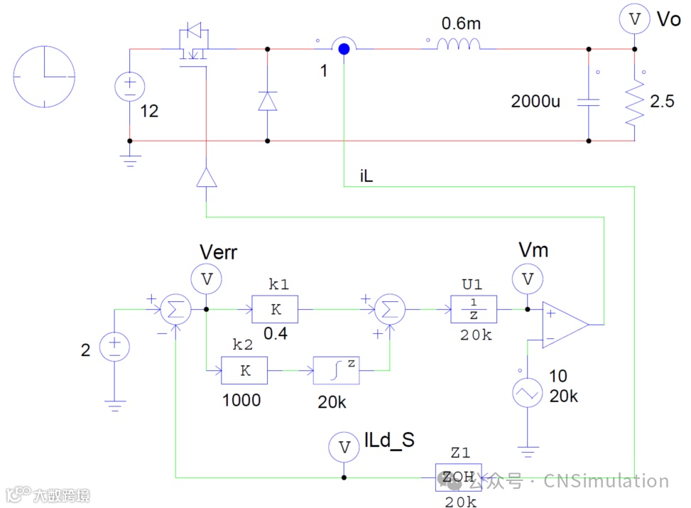 buck变换器采用平均电流模式控制,开关频率20 kHz,单位延时模块U1代表数字控制固有的一个周期延时。