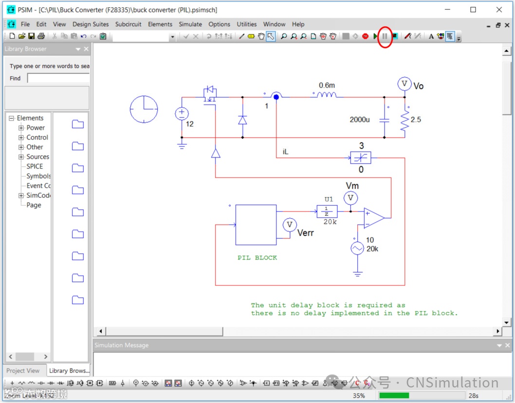 对之前的电路进行修改,除了PWM发生器和单位延时模块U1,移除控制电路,用PIL模型替代(PIL模型位于模型库中Elements>> Control >> PIL Module下)。保留单位延时模块的原因是PIL模型不包括任何延时。同时PIL的输入需要限制在0~3V范围内,这是为了模拟内置的A/D转换器的限幅特性,防止输入超出限定范围。