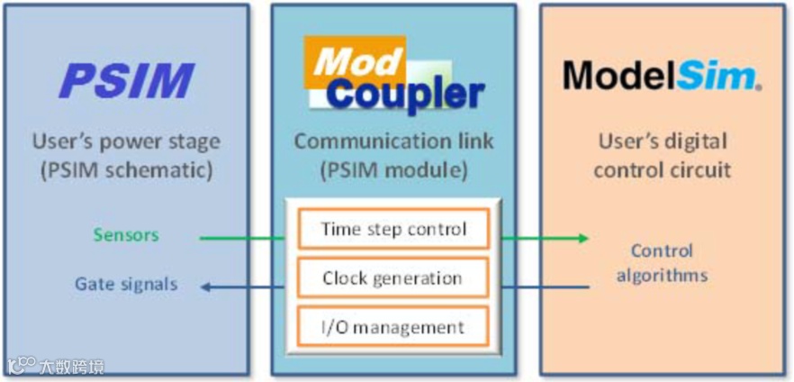 ModCoupler-Verilog是PSIM软件的一个模块,专门用于仿真软件ModelSim®和PSIM®之间的通信接口,利用该模块,可以对采用PFGA控制的电力电子设备进行联合仿真。这种情况下,采用Verilog描述的数字控制算法将在ModelSim中进行仿真,而功率级将在PSIM中进行仿真。