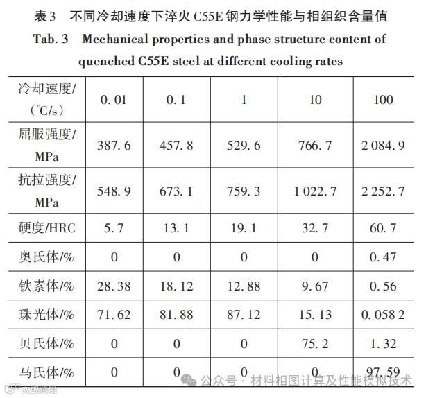 由图4可知,C55E钢的相变区域分为铁素体转变区、珠光体转变区、贝氏体转变区和马氏体转变区4个区域。图4也给出了不同冷却速度下火C55E钢的力学性能与相组织含量值。由表3可知:当C55E钢的冷却速度在0.01~1℃/s范围内时,随着冷却速度增加,铁素体含量逐渐减少,珠光体含量增加,不会出现贝氏体和马氏体;当冷却速度≥5℃/s时,开始出现贝氏体;随着冷却速度增加,贝氏体的数量增加,而珠光体和铁素体的数量逐渐减少:当冷却速度>105℃/s时,开始出现马氏体;随着冷却速度的继续增大,马氏体的数量逐渐增加,而铁素体、珠光体和贝氏体的数量减少。因此,要想使C55E钢获得90%以上的马氏体,其冷却速度应大于临界冷却速度 50 ℃/s。