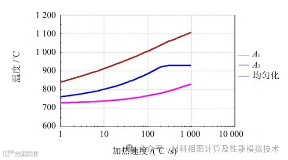 使用金属材料相图计算和性能模拟软件JMatPro计算得到 C55E钢的TTA 图。TTA图是指钢在不同的加热速度下其A1温度、A3温度、奥氏体均匀化的温度和时间的关系,即合金的TTA图,如图2所示。由图2可知加热速度对 C55E钢的奥氏体化参数的影响。
