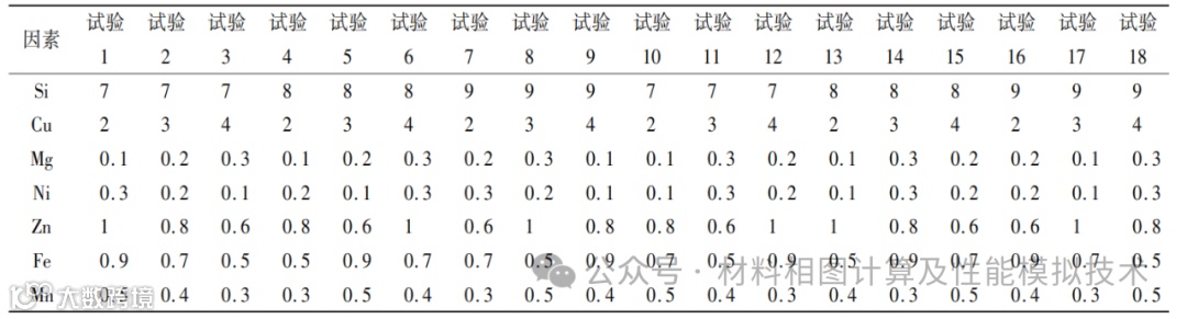 针对 AC4B 标准成分中的 Si、Cu、Mg、Mn、Zn、Ni、Fe 等元素各取3 水平,具体含量见表1。