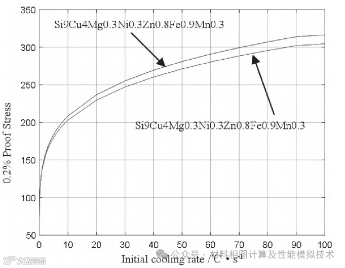 图1 利用JMatPro软件计算的合金0.2%屈服应力随初始冷却速率的变化曲线