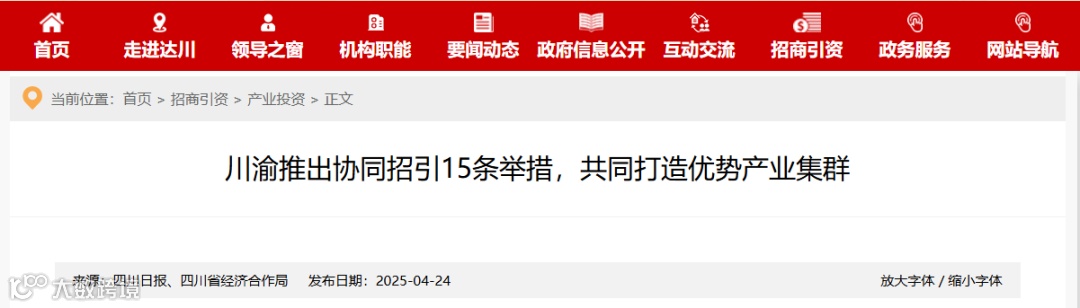 2025年,川渝两地联合推出协同招引15条举措,进一步深化川渝高质量协同招引,共同打造“双圈”优势产业集群。成渝地区双城经济圈协同招商联席会议机制,探索利益共享机制,促进招商项目有效流转。