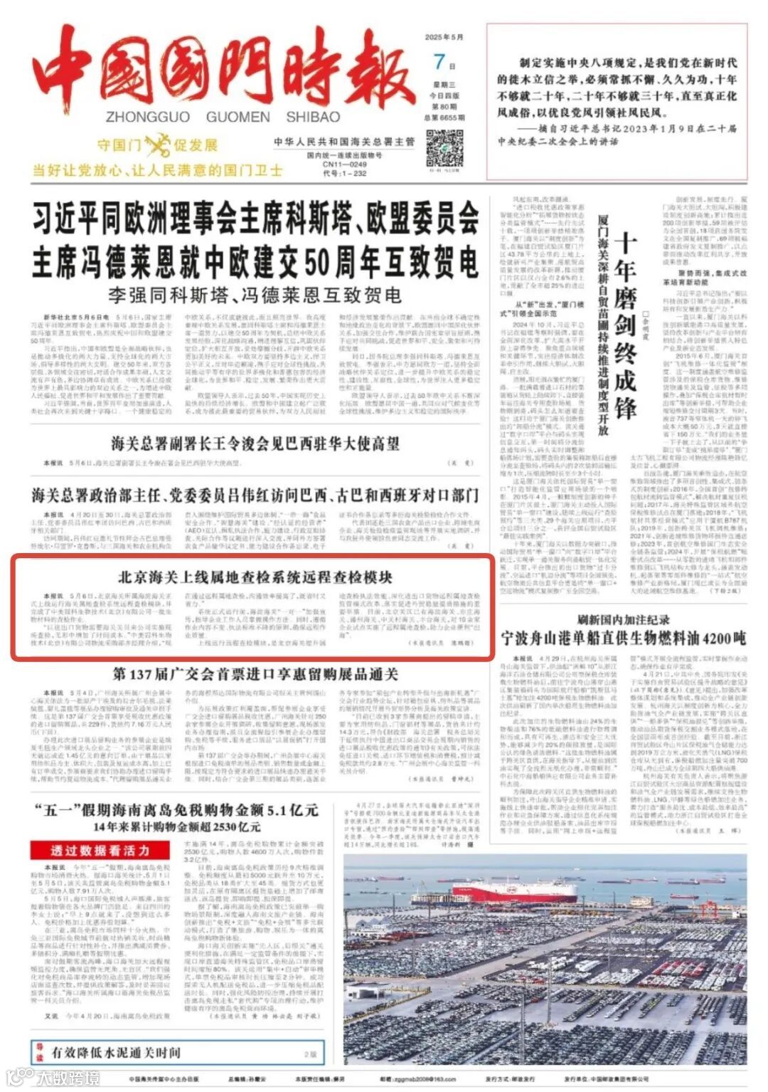 导读:《中国国门时报》头版(2025年5月7日)通讯员:陈鹏锴5月6日,北京海关所属海淀海关正式上线运行海关属地查检
