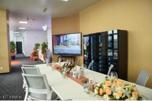 步入新址,内部装饰现代且专业。宽敞明亮的会议室里,精心布置的长桌摆放着鲜花、美酒、矿泉水和小食,营造出热情而友好的氛围。墙上的大屏幕展示着物流运输场景,彰显着公司的业务活力。