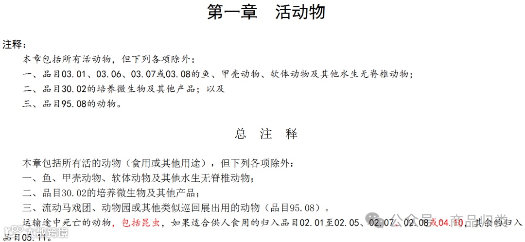 首先根据章的标题,我们知道第一章为活动物,但是根据归类总规则一“类、章及分章的标题,仅为查找方便而设;具有法律效力的归类,应按品目条文和有关类注或章注确定,如品目、类注或章注无其他规定,则按以下规则确定。”,章标题仅是为了方便查找而设,有法律效力的是品目条文、有关的类注或章注。所以我们应看第一类的类注释、第一章的章注释和品目条文。