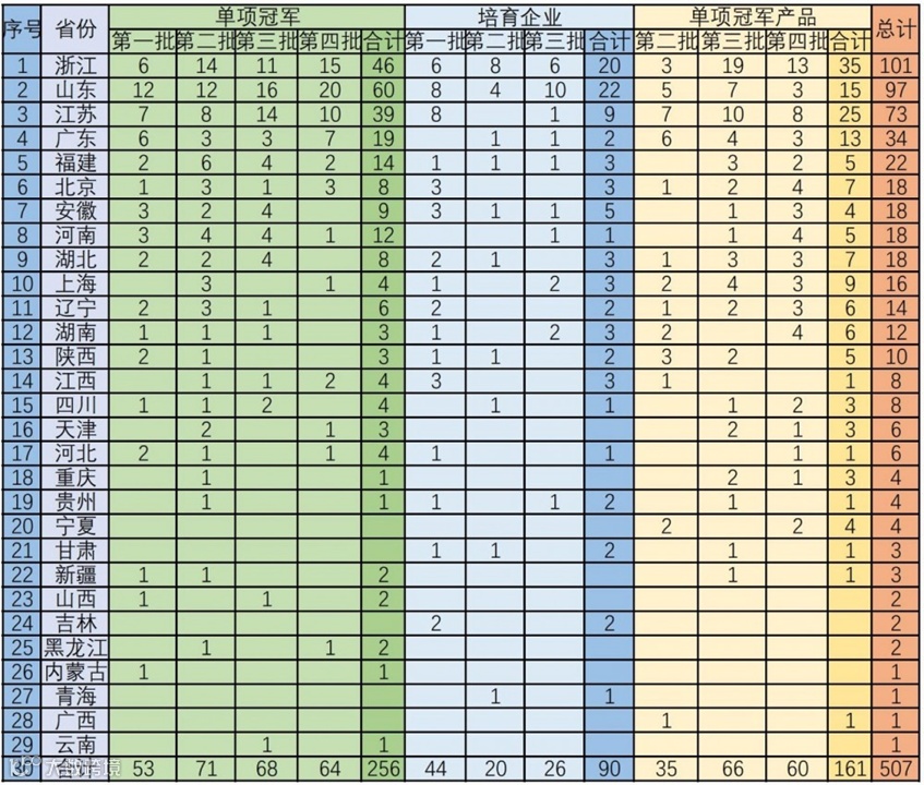 从分省来看分析这些冠军企业的分布,可以发现,东南沿海的隐形冠军企业相对来说比较集中。三项指标合计,浙江的隐形冠军企业总数达到101家,其次是山东,共有97家,再次是江苏,有73家。三个省的隐形冠军企业总数达到271家,超过总数的一半。