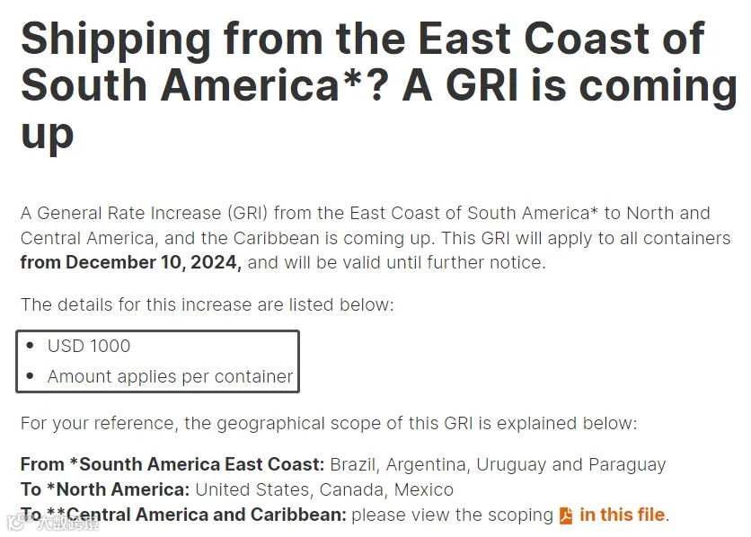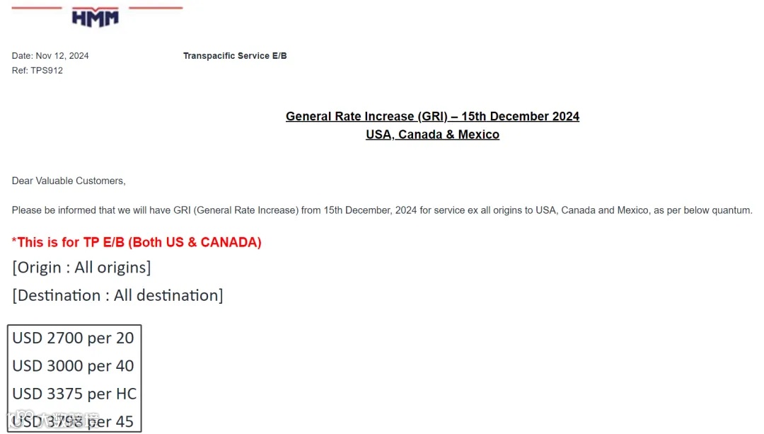 从2024年12月15日起对所有始发地到美国、加拿大和墨西哥的服务实行 GRI(全面费率上涨)。详情如下: