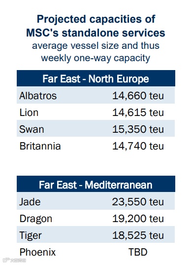 “Lion”航线:原由19,437标箱的MSC MIRJA轮和23,656标箱的MSC MINA轮运营,而今年的第三航次MSC已经已改用了要相对更小一些的15,413标箱的MSC OLIVIA轮。随后的计划也显示,MSC将投入17艘13,000-16,616标箱船舶,平均单船运力降至14,615标箱。 -