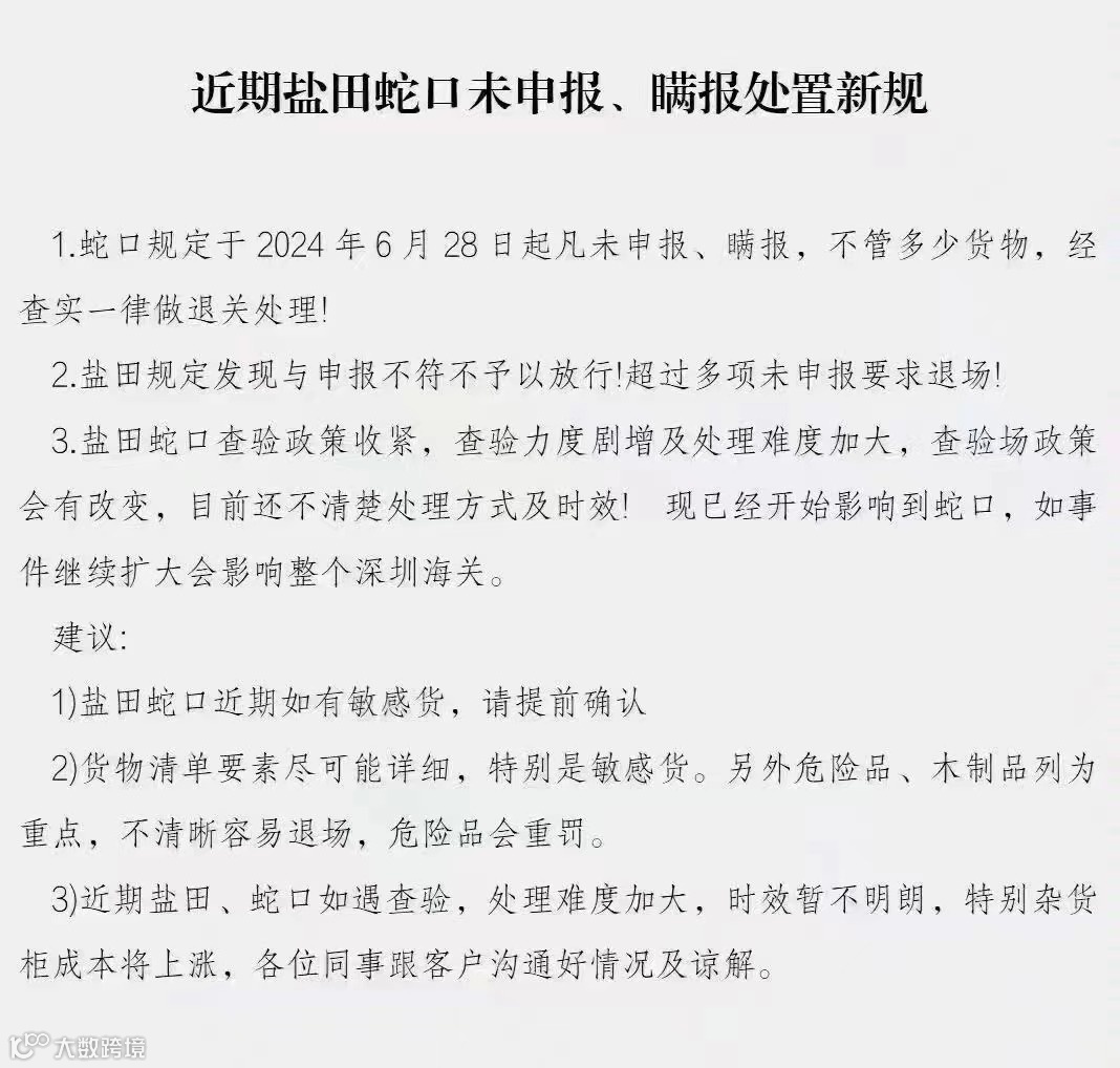 蛇口:自2024年6月28日起,任何未申报或瞒报行为,无论货物数量多少,一经查实,将立即执行退关处理。