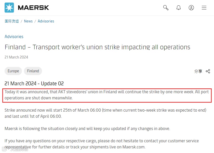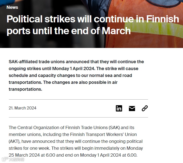 德迅表示,SAK附属工会宣布,他们将继续进行罢工,直到2024年4月1日星期一。芬兰港口的船舶装卸工作仍处于暂停状态,在罢工期间,集装箱不能从港口取货或运送到港口。由于罢工,空运物流可能会出现意外延误和额外费用。