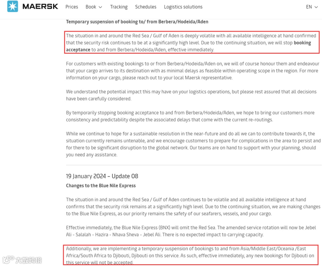 马士基宣布:暂停往返柏培拉/荷台达/亚丁以及吉布提的订舱,达飞宣布连接