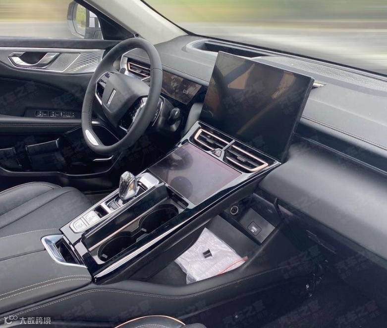 粗略的看,新车换用了两辐方向盘,液晶仪表为内嵌式,根据前方的“深坑”推断车辆或有着大尺寸HUD抬头显示。电子挡杆为类似宝马的水晶挡杆造型,桥式副中控台下方有着较大的储物空间。