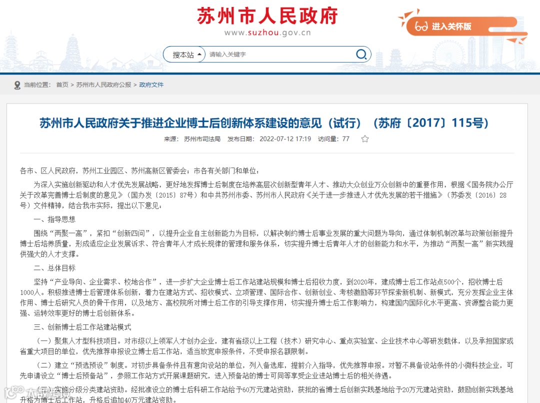 苏州市关于博士后的政策文件