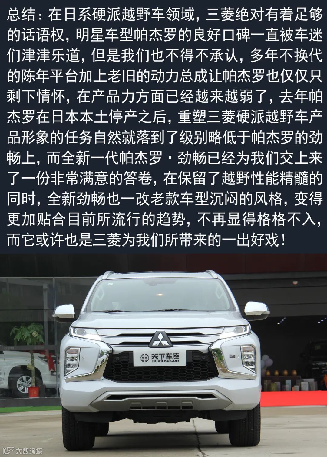 此次全新一代的2020款帕杰罗·劲畅通过官方平行进口的方式在国内进行销售,它的销售渠道相比其他车型而言要更加广阔,消费者们购车时的选择余地也要更大一些,而它28.98-30.98万元的售价已经对市面上的很多主流合资中型SUV车型造成了相当大的冲击,除了价格方面,全新劲畅更有自己的优势与王牌,出色的越野性能和极其吸睛的外形设计以及灵活多变的空间实用性都是它独一无二的优势,想要在30万元价格区间之后选择一辆兼顾实用和性能的硬派SUV车型,也就只有全新劲畅一枝独秀了吧。