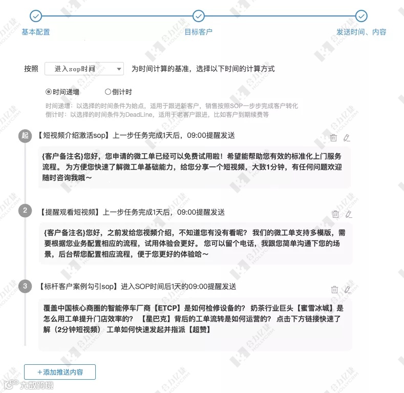 截个我们系统实际配置sop的界面吧,这是我们公司自己的一个现场服务工单产品,对潜客进行培育的sop,总共20多步,截了前几步可以看一下: