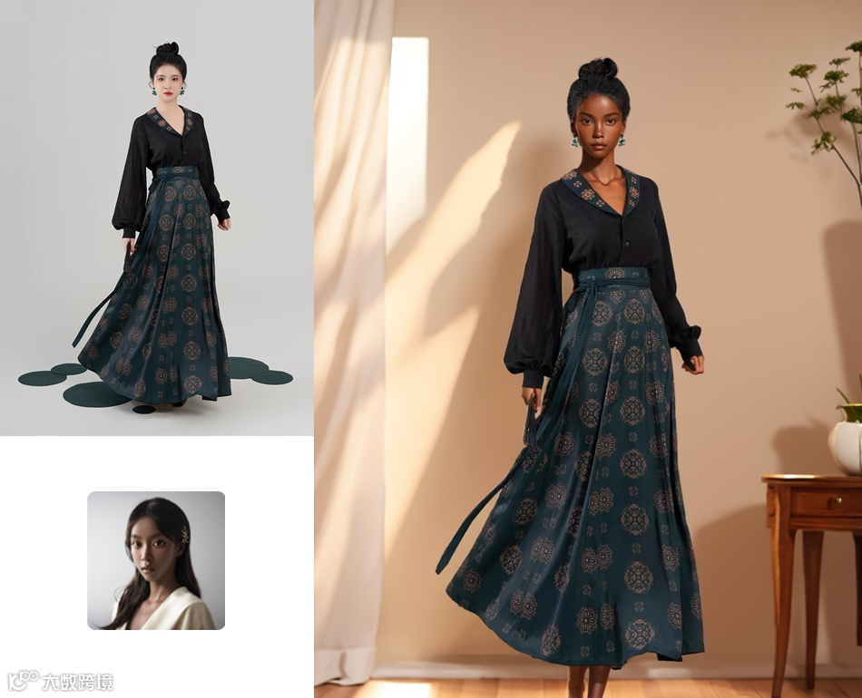 近年来,在文化自信的推动下,在国内外掀起了一股“汉服热”。尤其是2022年的“迪奥马面裙”事件后,“最好的保护方法就是穿出去”成为共识,大家开始将马面裙、新中式这样的服饰融入日常穿搭。 马面裙作为爆款单品出海,也给汉服行业带来了新的契机。在国外的一些独立站,汉服客单价在80-130美金,有的年营收甚至可达2000万刀。 汉服销售离不开商品图的拍摄,而汉服生产商大多都在国内,使用的都是国内的模特。 如何用最小成本变更模特图?让模特图满足海外市场白、黄、黑不同人种的需求? 登录爱云画https://www.aiyunhua.com/进入【AI工具箱】,点击【AI模特】功能。 第一步,选择假人模特、真人模特 第二步,新建任务,上传汉服模特图,点击选区,比如下图主要选中汉服部分,保持服饰不变。 第三步选择人物和场景,点击生成 效果图————