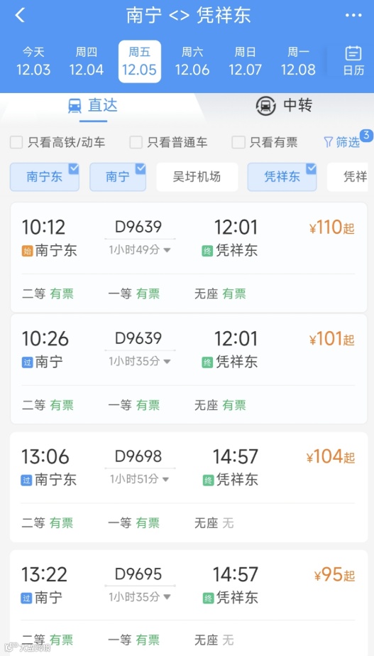 票价方面,D9698次南宁东至凭祥东,一等座166元、二等座104元;D9695次南宁至凭祥东,一等座152元、二等座95元;D9689次南宁东至凭祥东,一等座175元、二等座110元.