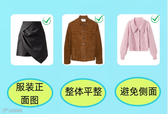 上传服装平铺图,支持单件上传、搭配上传(上传的服装正面平铺、保证服装整体平整、无遮挡)