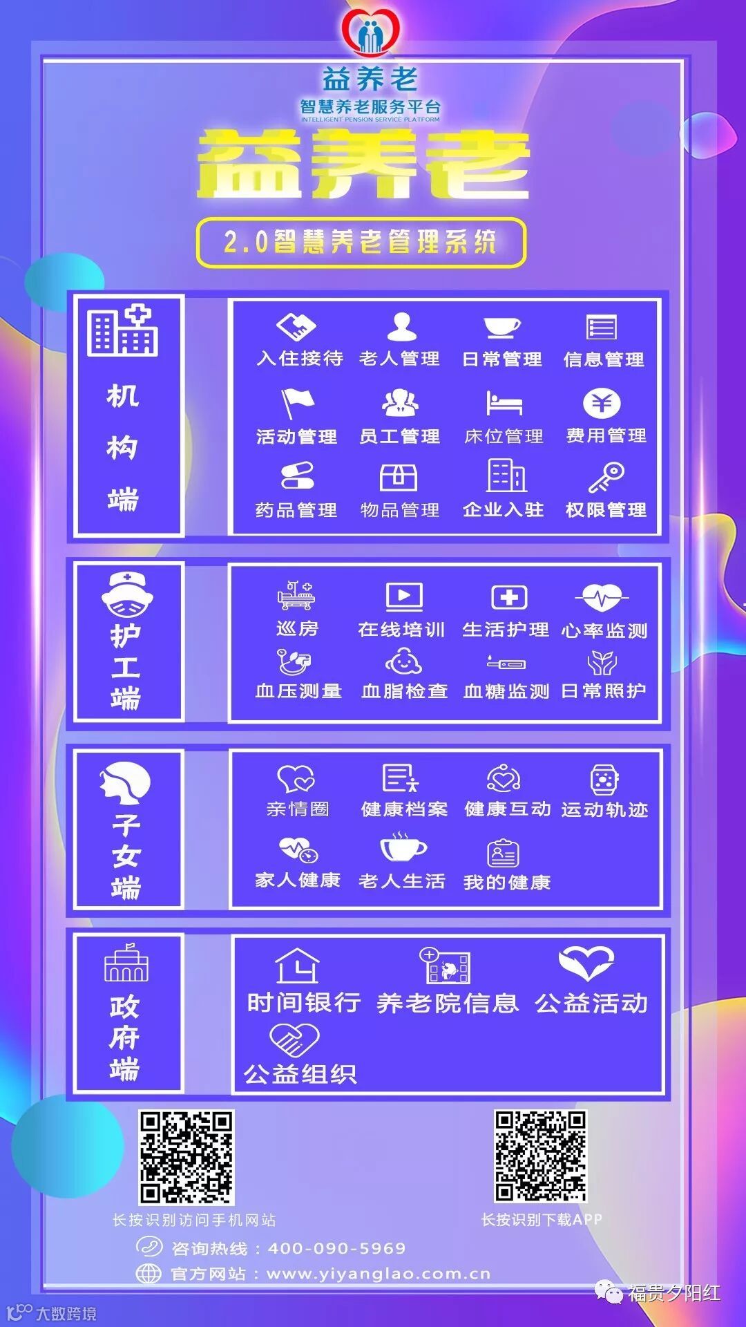 【益养老】智慧养老平台,是真正实现了互联网+养老的专业养老服务平台,智慧养老管理系统包括机构端、护工端、子女端、政府端。让养老服务更科学、更规范、有效解决了养老机构的运行管理难题,降低了风险,打通了机构、老人、子女三者之间信息不畅的难题。让养老更智慧,让老人更舒心,让子女更放心!