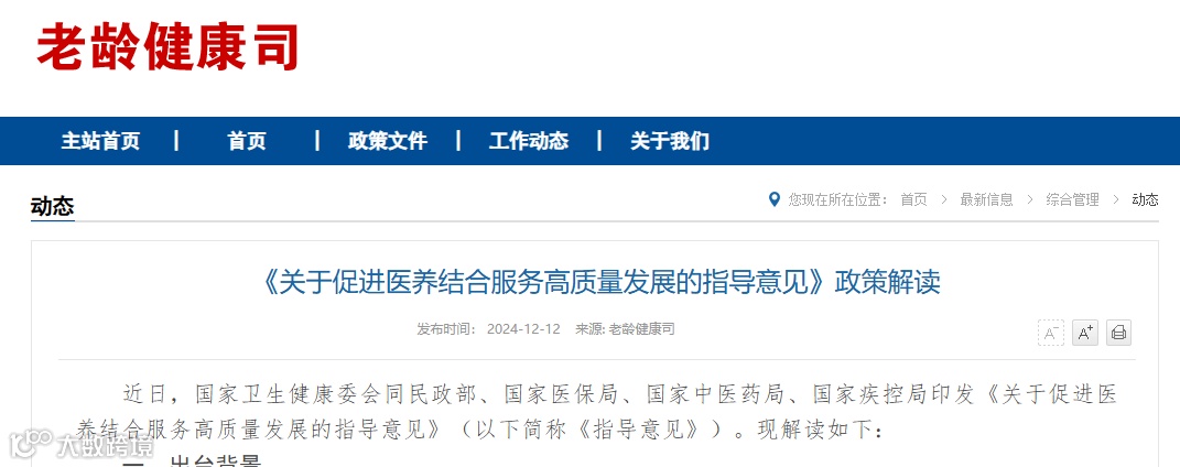 在新时代背景下,随着我国人口老龄化趋势的不断加剧,医养结合服务作为一项重要的社会服务,已经成为提升老年人生活质量、实现健康老龄化的关键措施。为深入贯彻落实党中央、国务院关于积极应对人口老龄化、推进健康中国建设的决策部署,国家卫生健康委、民政部、国家医保局、国家中医药局、国家疾控局联合发布了《关于促进医养结合服务高质量发展的指导意见》。该指导意见的出台,对于推动养老服务体系和医疗卫生服务的深度融合,实现老年人健康养老具有重大意义。