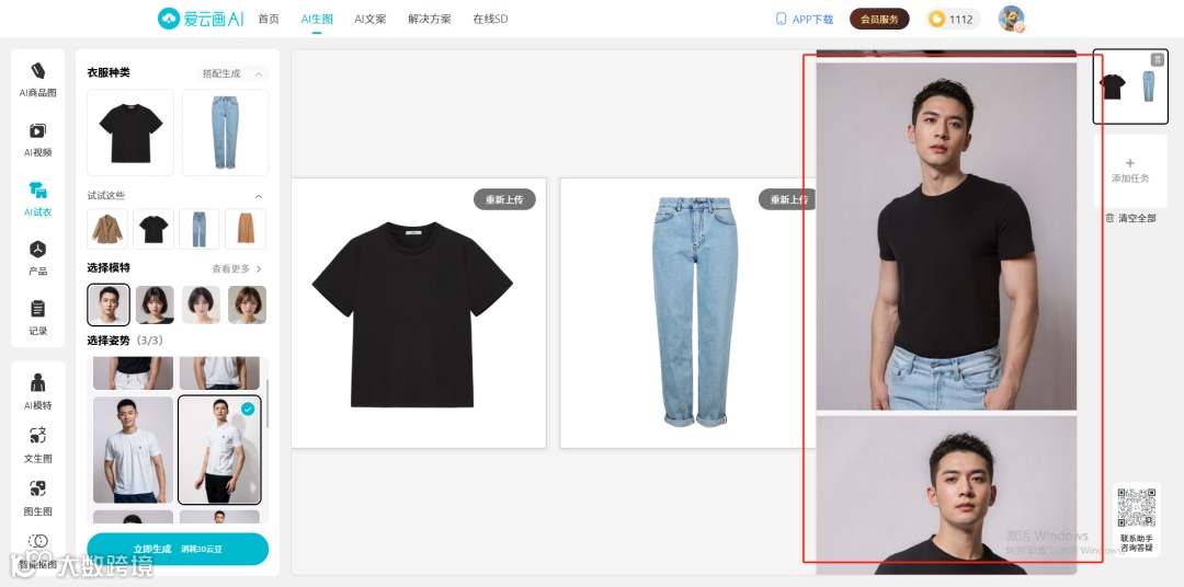 爱云画AI不用真人模特拍摄,只需要用一张平铺图,就能得到多场景多姿势的模特穿搭图