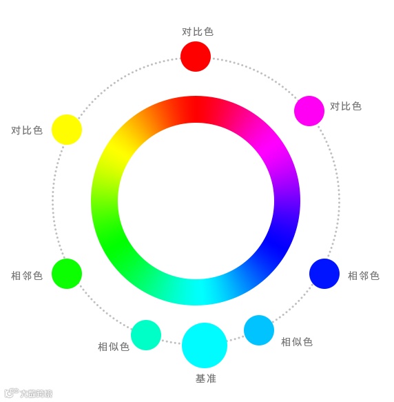 色轮虽然有各种各样,但是在描述色彩关系时结果能大体相同,以一种颜色为基准色,最靠近基准色的是相似色,略远的是相邻色,更远的、相对的就是对比色。不过要记住视觉上对比度最大的是黄蓝和红绿。