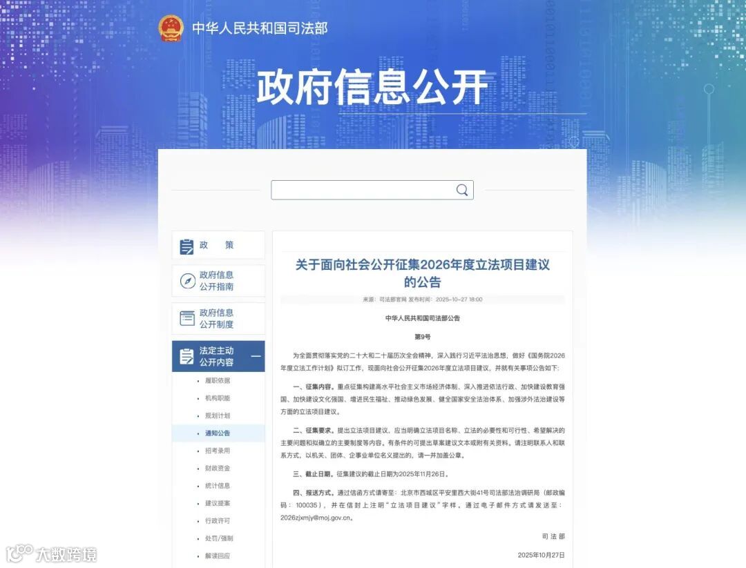 根据官方公告,司法部已于2025年10月27日启动《2026年度立法项目建议征集》,征集期截至2025年11月26日。这为公众直接参与国家立法提供了宝贵渠道。