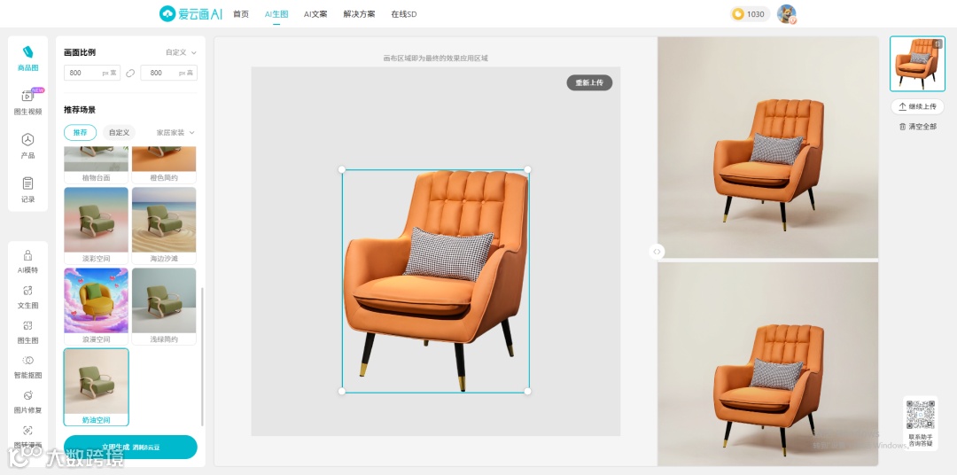 卖家们无需再为布置复杂的拍摄场景而烦恼,利用爱云画的 AI 商品图功能,轻松打造出具有吸引力的家居商品图,让消费者能够更直观地感受到每一件家居产品所带来的美好生活体验。