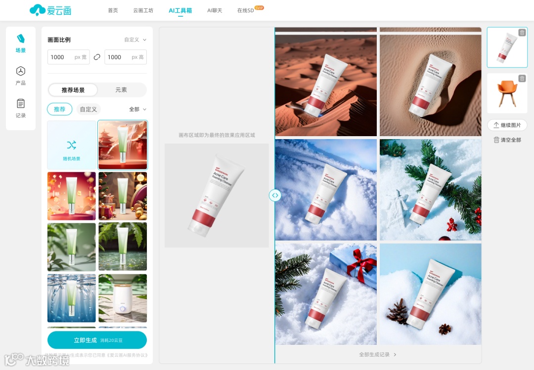 AI商品图,只需上传商品图片,使用AI即可生成海量的商品图,内置多种商品场景,也可以通过文字描述生成自定义场景,一键输出影棚级商品摄影图,无需拍摄和后期,简单好用,可用于电商推广、市场宣传营销等终端场景展示。