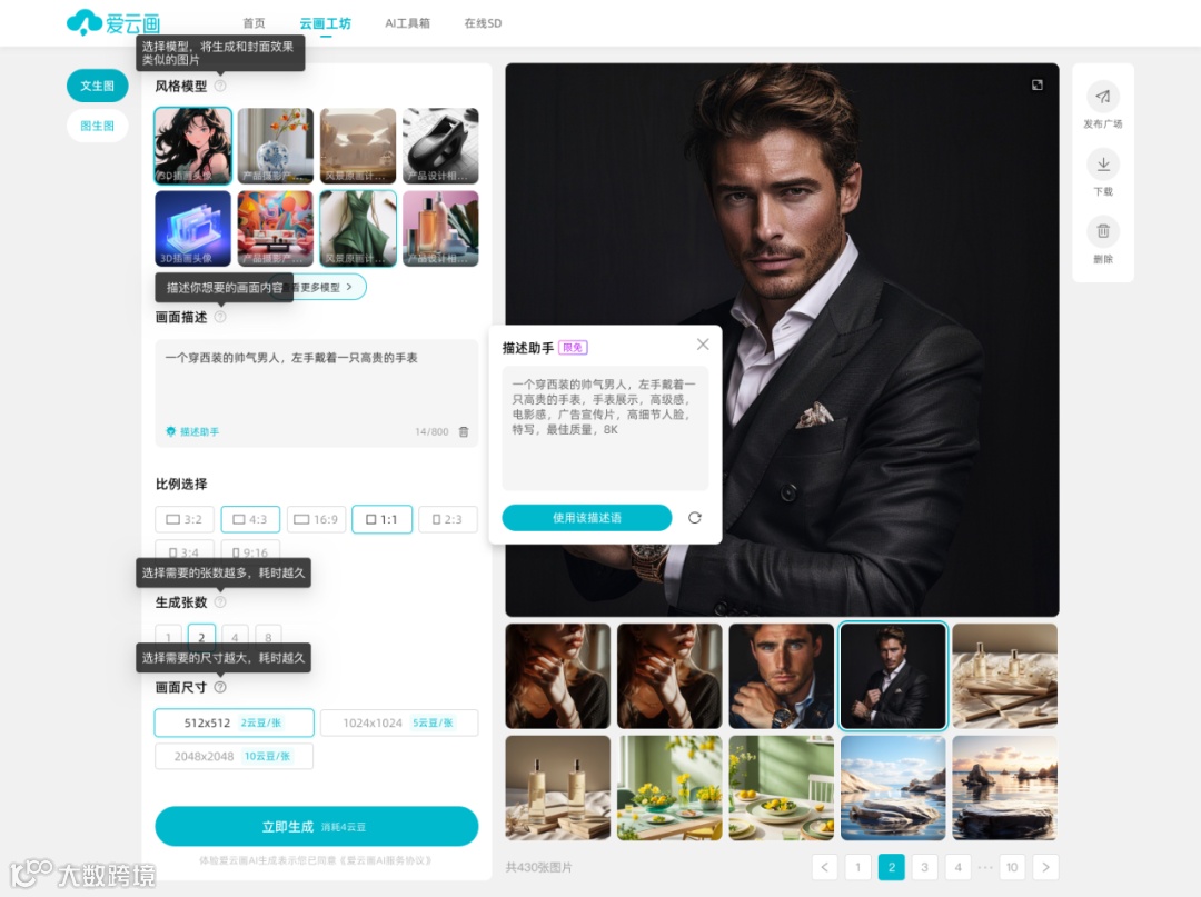 平台提供的AI图像生成工具,通过输入画面的描述文字或上传参考图片,AI一键智能化生图,适用于不同风格的图像生成,为企业和个人提供多样化选择。AI批量生成场景图、营销图、设计图所需素材,减少重复工作,实现效率的快速提升。