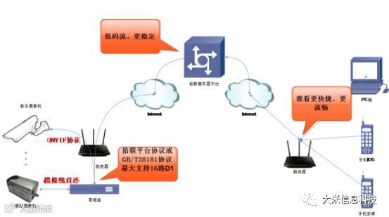 该方案的关键之一在于前端硬件设备(思维盒)的技术实现,思维盒兼容国际标准ONVIF协议以及国标GB/T28181协议,使得思维盒能够获取目前市场绝大部分品牌摄像机的音视频流并能实时操控,从而实现真正意义上的兼容,同时思维盒还应具备在保证视频质量的前提下将视频流的码流最大限度的降低,节约带宽,增加传输能力,同时兼容国标GB/T28181协议可对接国标平台。